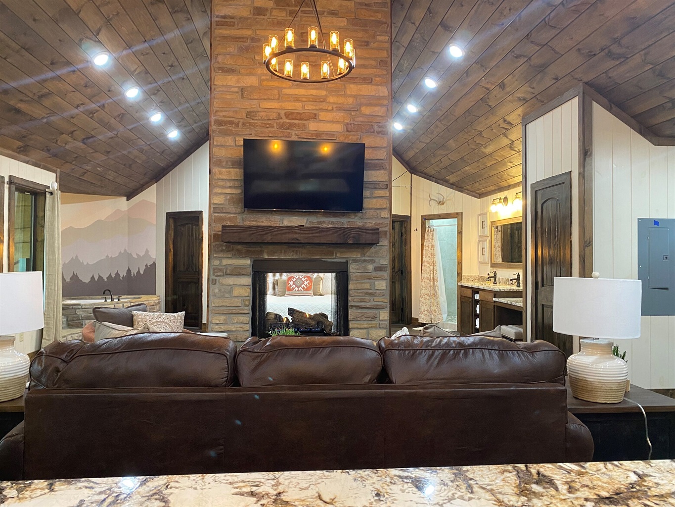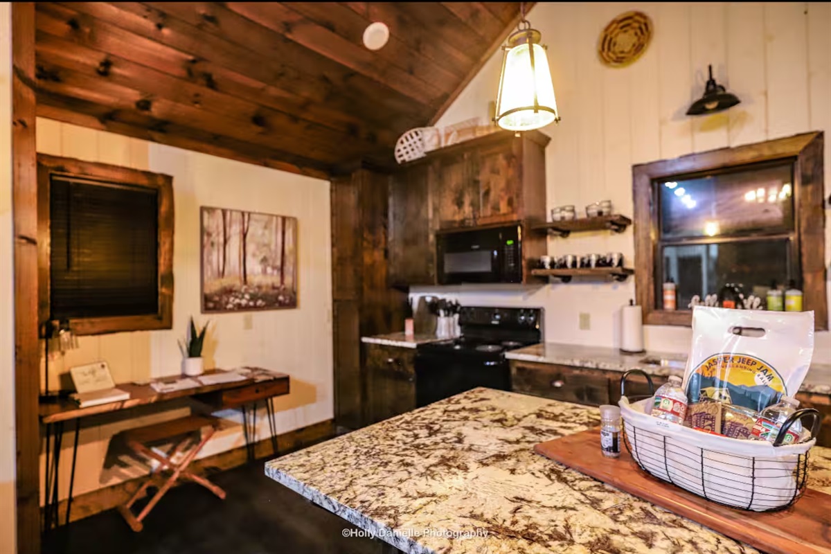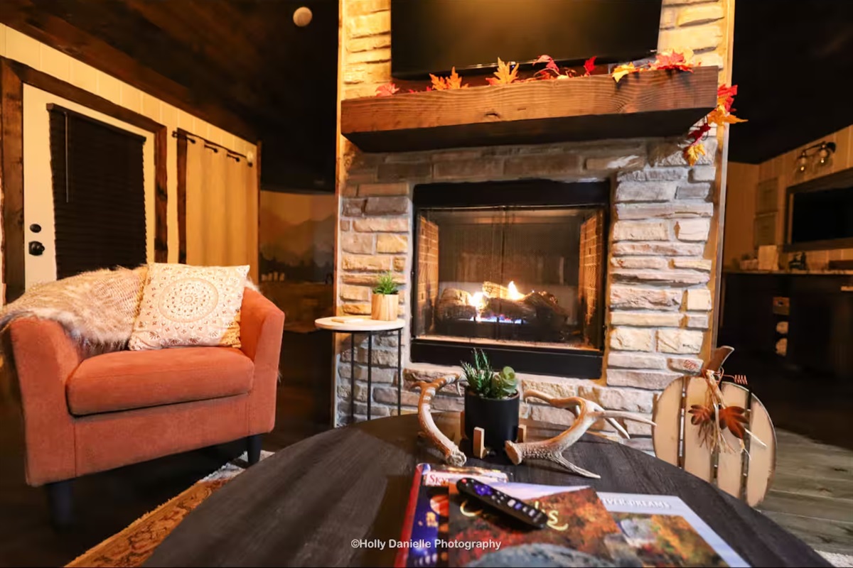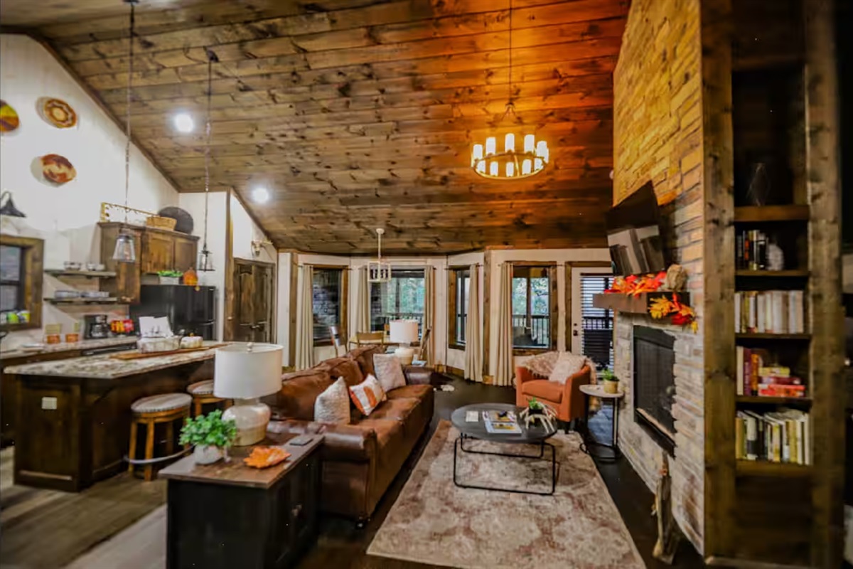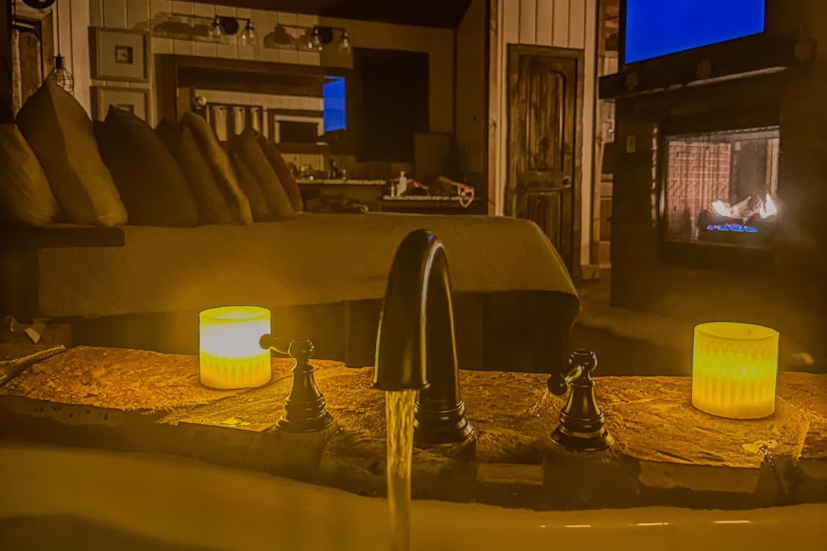 1 Bedroom • 1 Bathroom 1 Bath • Sleeps 1-4Built in 2023, this romantic couples’ retreat near the Buffalo National River and the town of Jasper, AR, offers gorgeous mountain views of the Ozarks. The cozy cabin features an open studio concept with a see-through gas fireplace, a custom rock tub with a mountain mural surround, and beautiful furnishings. The king-size custom platform bed is made from 100+-year-old barn wood. The cabin also includes a private toilet room and a gorgeous dual-fixture ceramic tile shower with sparkling glass tile accents. A stackable washer and dryer are located next to the fully stocked kitchen, and there is even a desk for any unexpected work duties!