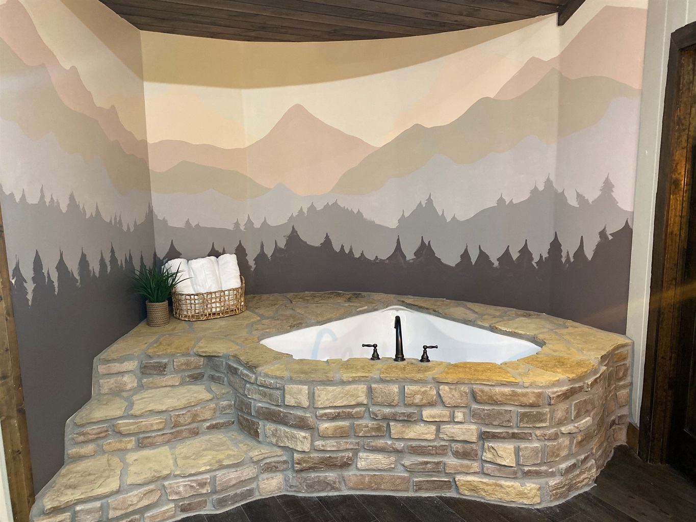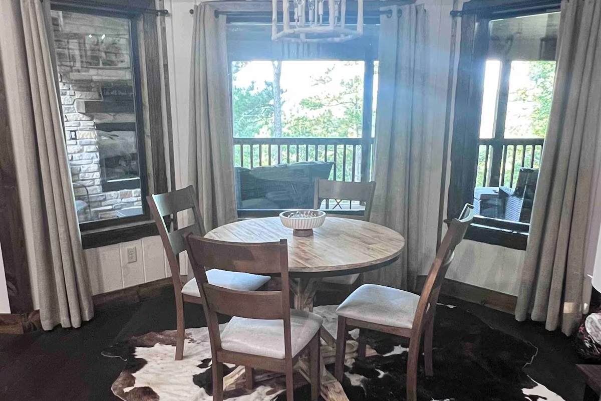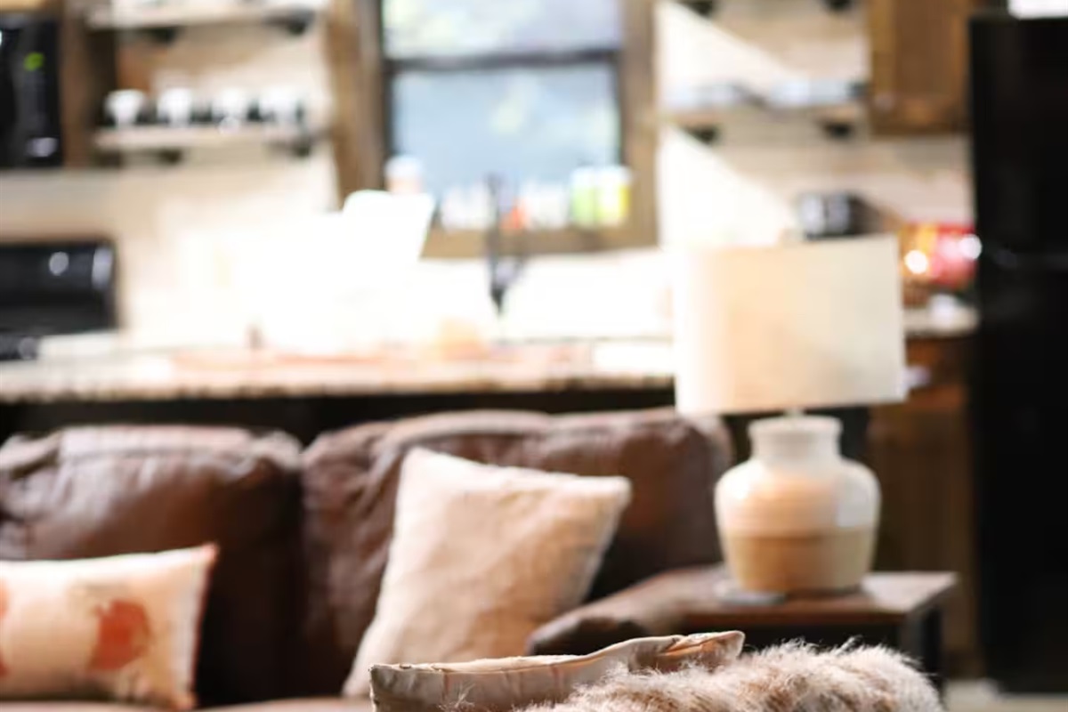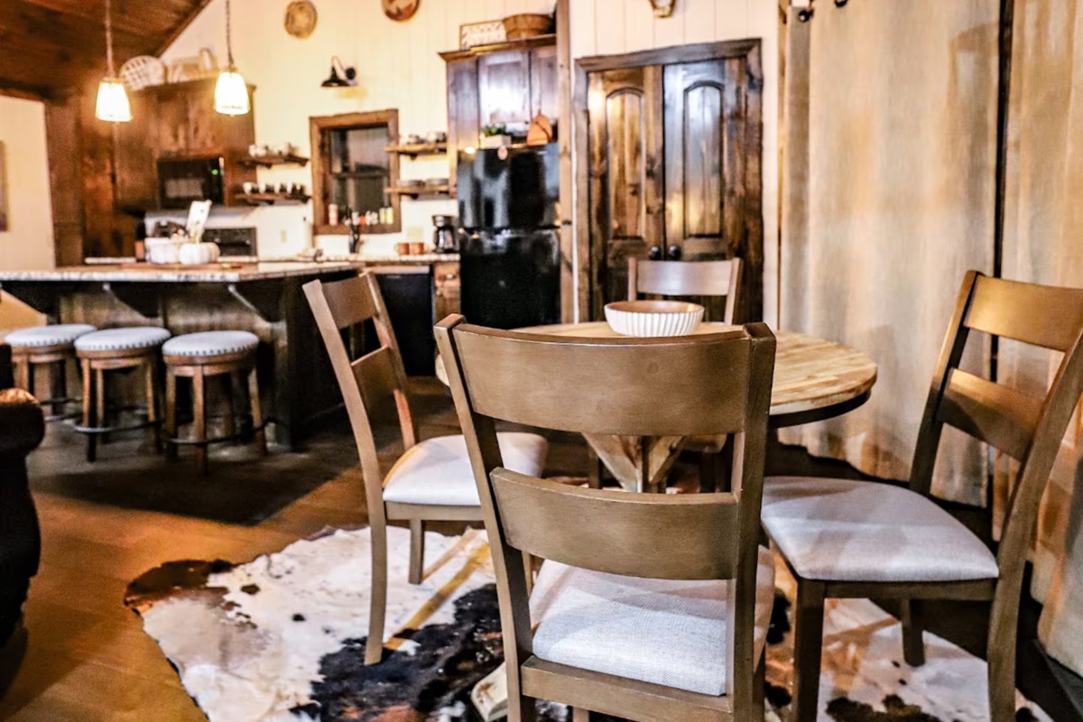 1 Bedroom • 1 Bathroom 1 Bath • Sleeps 1-4Built in 2023, this romantic couples’ retreat near the Buffalo National River and the town of Jasper, AR, offers gorgeous mountain views of the Ozarks. The cozy cabin features an open studio concept with a see-through gas fireplace, a custom rock tub with a mountain mural surround, and beautiful furnishings. The king-size custom platform bed is made from 100+-year-old barn wood. The cabin also includes a private toilet room and a gorgeous dual-fixture ceramic tile shower with sparkling glass tile accents. A stackable washer and dryer are located next to the fully stocked kitchen, and there is even a desk for any unexpected work duties!